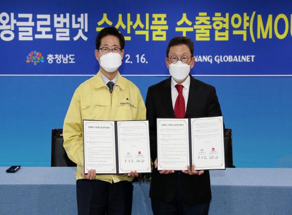양승조 지사는 16일 도청 상황실에서 강승헌 미국 왕글로벌넷 대표이사와 수산식품 수출 협약을 체결했다.