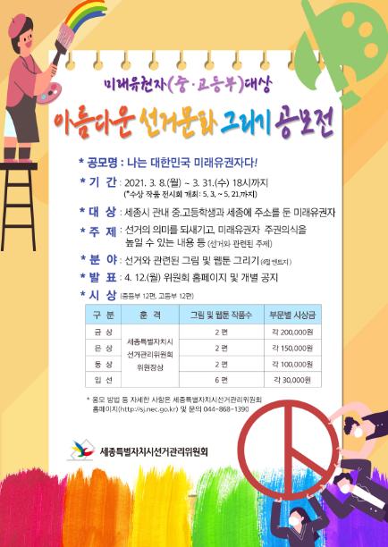 세종특별자치시선거관리위원회는 미래유권자를 대상으로 오는 3. 8. ~ 3. 31.까지 ‘아름다운 선거문화 그리기 공모전’을 개최한다고 밝혔다.