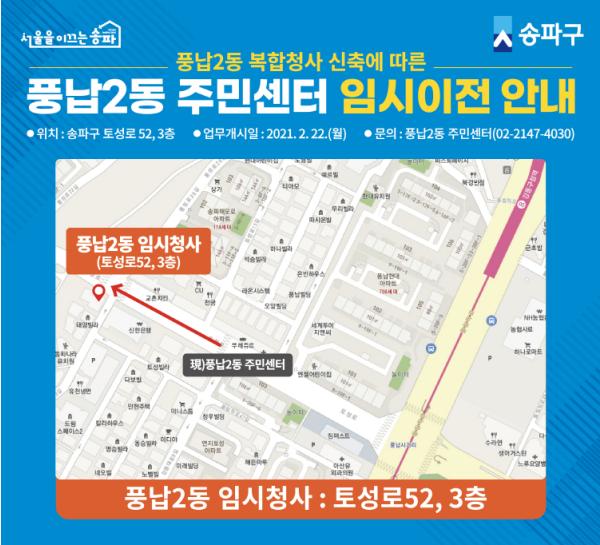 송파구는 풍납2동 주민센터(토성로64) 신축청사 건립을 앞두고, 주민불편을 최소화할 수 있도록 2월 22일부터 임시청사를 운영한다.