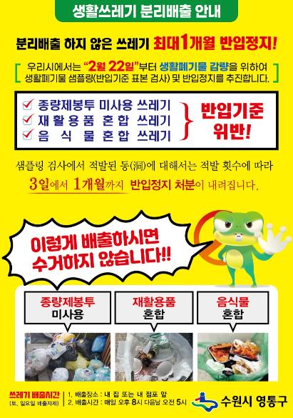 수원시 영통구가 오는 2.22일부터 시행되는 ‘반입기준 위반 생활폐기물 반입정지’로 인해 주민들이 불편을 겪지 않도록 주민홍보에 힘쓰고 있다.
