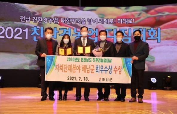 해남군은 2020년 전라남도 친환경 농업대상 최우수기관으로 선정돼 상사업비 5,000만원을 확보했다. 친환경 농업대상 최우수기관 선정은 2년 연속으로, 시상식은 18일 전남도청에서 2021년 친환경농업 다짐대회에서 열렸다. 해남군은 지자체 기관표창 외에도 축산분야에서 북평면 김소영씨가 최우수상을 수상하기도 했다.