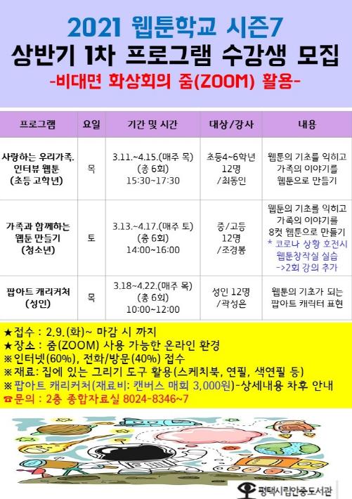 2021년 상반기에 진행될 '웹툰학교 시즌7' 1차 프로그램은 ‘사랑하는 우리 가족, 인터뷰 웹툰’(초등 고학년)(3.11.~4.15./매주 목/15:30), ‘가족과 함께하는 웹툰 만들기’(청소년)(3.13.~4.17./매주 토/14:00), ‘팝아트 캐리커처’(성인)(3.18.~4.22./매주 목/10:00)를 계획하고 있다.