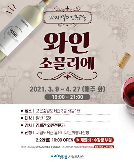 와인에 대한 수업인 만큼 이번 과정은 성인을 대상으로 하며, 포항시립도서관 홈페이지 문화행사신청 코너를 통해 22일 오전 10시부터 사전신청이 가능하다.