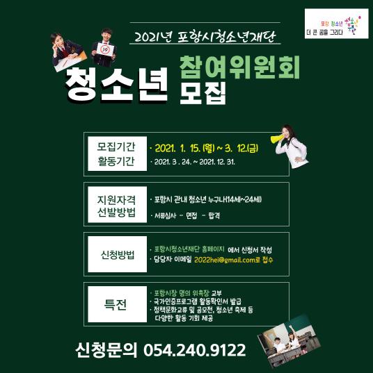 포항시청소년재단에서 포항시청소년참여위원회 위원을 오는 3월 12일까지 모집한다.