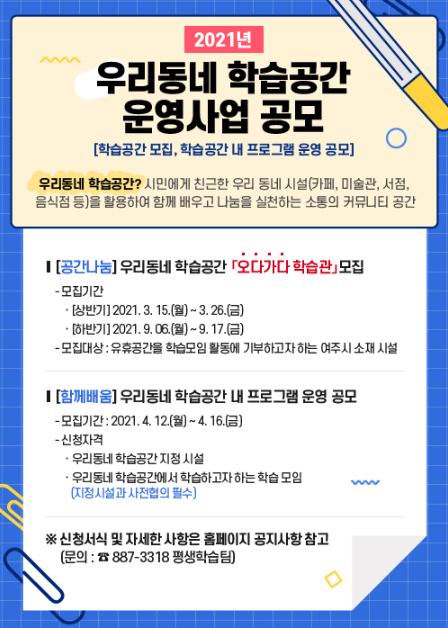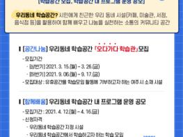 여주시 평생교육과는 「2021년 우리동네 학습공간 운영사업」 공모를 진행한다. 올해부터 여주시 우리동네 학습공간은 「오다가다학습관」 이라는 자체 브랜드로 새롭게 출발한다.