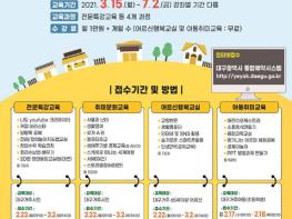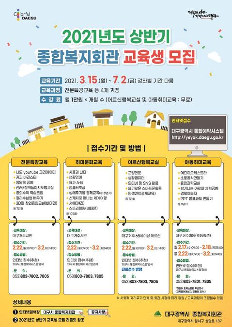 교육신청은 2월 22일 09시부터 3월 2일 14시까지 대구광역시 통합예약시스템을 통해 인터넷으로만 할 수 있고, ‘어르신 행복교실’에 한해 전화접수를 병행한다.