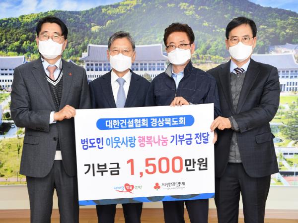 대한건설협회 경상북도회(배인호 회장)는 18일 코로나19로 어려움에 처한 자영업자 등 이웃을 돕기 위해 경북도와 경북사회복지공동모금회가 전개하는 범도민 이웃사랑 행복나눔에 성금 1,500만원을 기부했다.
