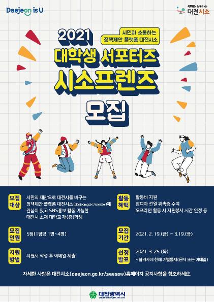 대전시소 대학생 서포터즈 ‘시소프렌즈’모집에는 개인 누리소통망(SNS) 활용에 능숙한 대전시 소재 대학 재(휴)학생이라면 누구나 참여 가능하며, 4명 이하의 팀을 구성해 3월 19일까지 접수하면 된다.