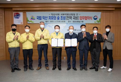서부지방산림청(청장 조준규)은 2월 17일 익산시와 ‘국립 익산치유의 숲’의 성공적인 조성을 위한 업무협약을 체결했다고 밝혔다.