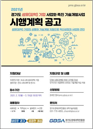 경기도와 경기도경제과학진흥원은 코로나19로 위축된 섬유산업에 새로운 활력을 불어넣기 위한 ‘2021 섬유(피혁)분야 기업 사업화 촉진 기술개발사업’을 추진한다고 18일 밝혔다.