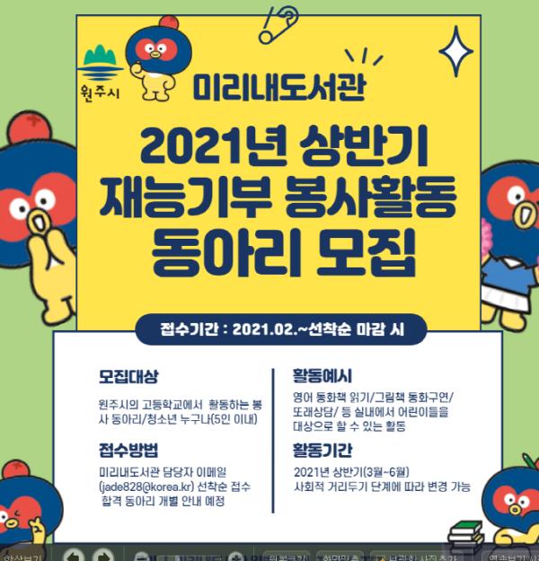 오는 3월 개관을 앞두고 있는 원주 혁신도시 미리내도서관이 상반기(3~6월) 재능기부 봉사활동에 참여할 고등학교 동아리 학생을 모집한다.