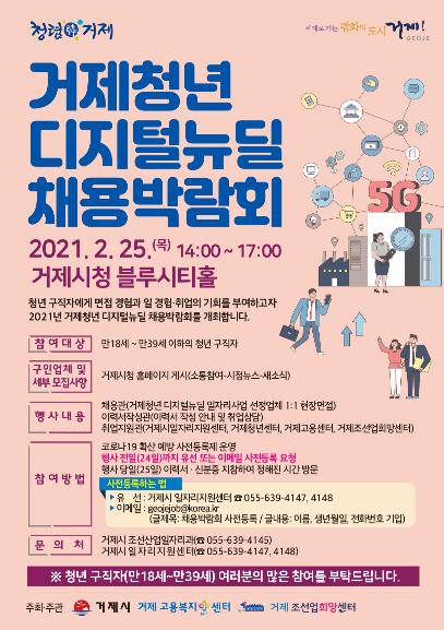 거제시는 오는 25일 거제시청 블루시티홀에서 ‘거제청년 디지털뉴딜 채용박람회’를 개최한다. 코로나19 확산 예방을 위해 분산 운영하며 만 18세에서 39세 이하의 청년 구직자를 대상으로 진행한다.