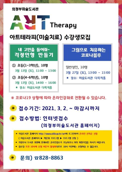 의정부미술도서관은 코로나19로 지친 시민들의 일상에 활력을 주고 마음을 치유할 수 있는 아트테라피(미술치료) 프로그램을 2021년 3월 13일부터 운영한다.