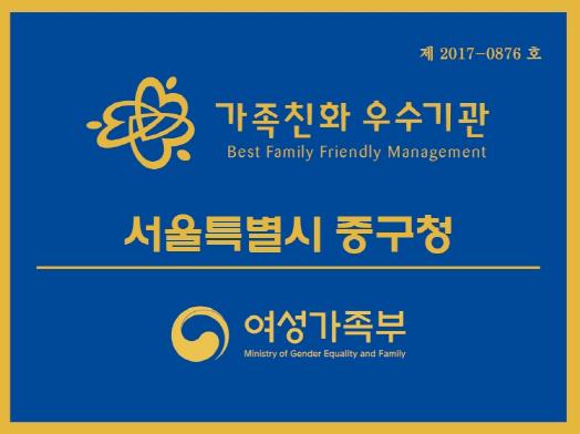 인증기준은 70점 이상이나 중구는 88.3점 높은 점수로 통과되었다. 인증을 위한 평가는 1차 서류심사와 2차 현장심사를 통해 진행됐다. 특히 현장심사에서는 구청장 심층인터뷰를 통해 가족친화 직장 문화 및 여성관리자 육성에 대한 강한 의지와 관심이 확인됐다.
