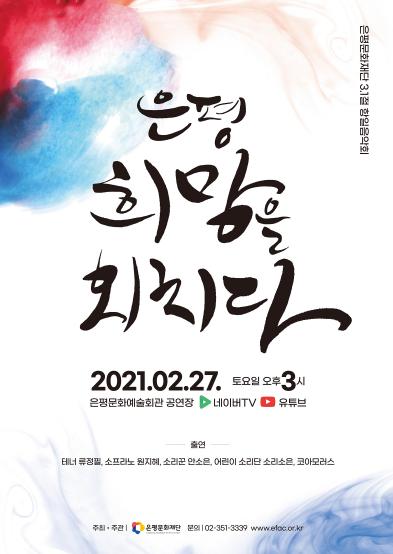 [한국쇼핑몰뉴스, 최영진기자] 은평문화재단은 3.1절 기념 항일음악회 ‘은평, 희망을 외치다’를 오는 27일(토) 오후 3시 네이버TV와 유튜브를 통해 온라인으로 개최한다.
