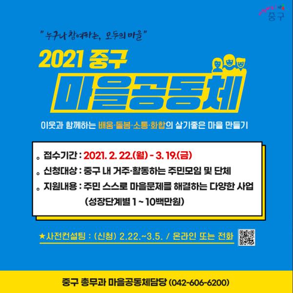 박용갑 청장은 “코로나 상황으로 이웃 간 따뜻한 관심과 소통이 더욱 필요해졌다”며, “이번 공모사업에 많은 주민이 참여해 마을에 활력을 불어넣어 주시길 바란다”고 말했다.