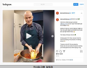 지난 2월 4일 김치 담그는 사진과 영상을 공개한 아이너 옌센(Einar Hebog?rd Jensen) 주한 덴마크 대사는 “김치소는 매우니 눈에 들어가지 않게 조심해야 한다.”라면서도 “김치 맛을 좋아해 일주일 뒤가 벌써부터 기다려진다.”라고 기대감을 숨기지 않았다. 옌센 대사는 누리꾼들에게 김치와 잘 어울리는 ‘꿀조합’ 음식을 추천해 달라고 썼다. 주한 덴마크 대사관의 페이스북, 트위터, 인스타그램, 블로그에는 한국, 덴마크, 캐나다 등 다양한 국적의 누리꾼들이 보쌈, 플레스케스텍(Fløskesteg, 덴마크 전통 돼지고기 요리), 고구마, 두부 등을 김치와 어울리는 음식으로 추천했다.