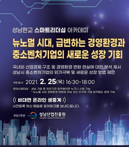 [한국쇼핑몰뉴스, 최영진기자] 성남산업진흥원이 뉴노멀 시대, 급변하는 경영환경에 대한 분석을 통한 중소벤처기업의 위기극복과 성장 방안을 마련하기 위해 2021년 첫 번째 ‘성남 판교 스마트리더십 아카데미’를 개최한다.
