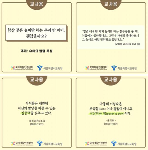 이에 서울시교육청은 전국 최초로 개발된 유치원용 인권교육자료를 개발하였다. 유치원용 인권교육자료는 유아, 교사, 보호자 뿐만 아니라 유치원 일반 종사자들까지 대상을 확대하여, 유아의 권리를 보호하는 의무이행자로서 역할하고 아동친화적인 교육환경을 조성하는데 큰 도움을 줄 예정이다.