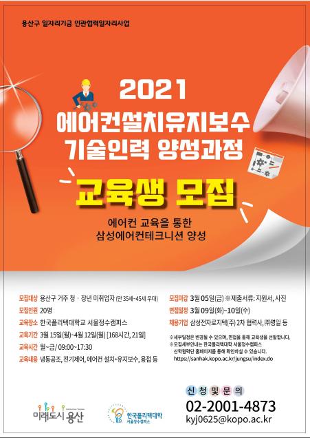 [한국쇼핑몰뉴스, 최영진기자] 서울 용산구가 2021년 ‘에어컨 설치·유지보수 기술인력 양성과정’교육생을 20명 모집한다.