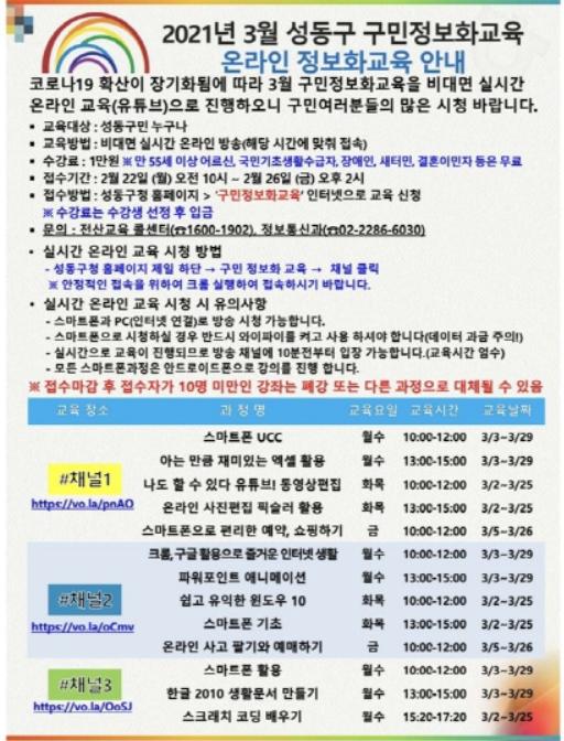 구는 지난해에 이어 3월부터 온라인(유튜브 채널)을 통해 구민 정보화 교육을 운영한다고 밝혔다. 그동안 구민 정보화 교육이 55세 이상 어르신이나 기초생활수급자, 장애인 등 정보소외 계층을 대상으로 운영했으나, 올해부터 연령에 관계없이 모든 구민을 대상으로 교육 기회의 폭을 넓혔다.