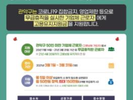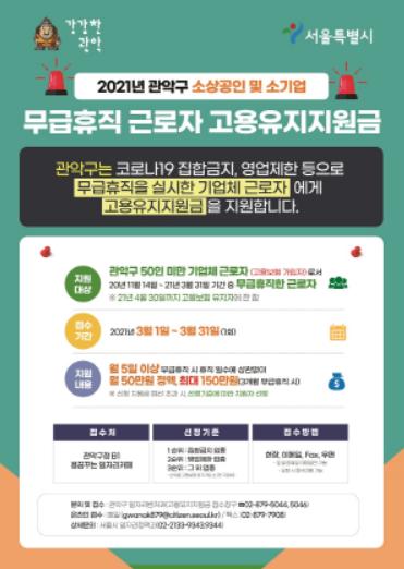 [한국쇼핑몰뉴스, 최영진기자] 서울특별시 관악구가 코로나19로 인한 집합금지, 영업제한 등으로 어려움을 겪고 있는 기업체 근로자의 실업예방과 생계유지를 위해 무급 휴직 근로자를 대상으로 ‘고용유지지원금’을 지원한다고 밝혔다.