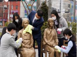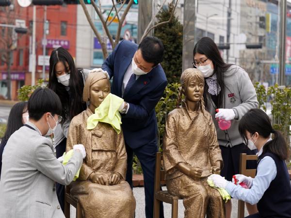 25일 이승로 성북구청장과 계성고 학생들은 새로이 둥지를 튼 한중 평화의소녀상을 닦아주며 환영했고 엄중한 표정으로 램지어 교수의 논문 게재 철회를 요구했다.