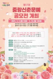 한편 올해로 17회를 맞는 중랑신춘문예 공모전은 순수문학작가 등단의 기회이자 문학의 저변 확대는 물론 지역 창작문화 발전에 큰 역할을 하고 있으며, 지난해에도 218명의 시민들이 486편의 문학작품을 공모한바 있다.