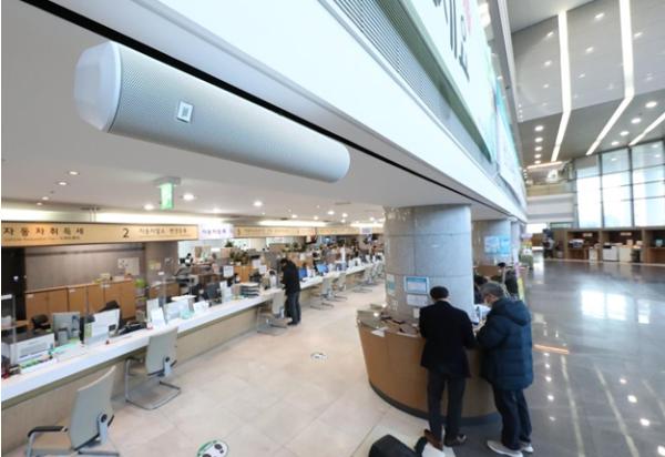 구청을 찾은 민원인은 물론 담당 공무원들이 보다 편안한 분위기에서 업무를 볼 수 있도록 구는 최근 구청 2층 종합민원실에 음원 송출 전용 노트북(1대), 오디오 믹서(2대), 앰프(1대), 스피커(12대)를 구매·설치했다.