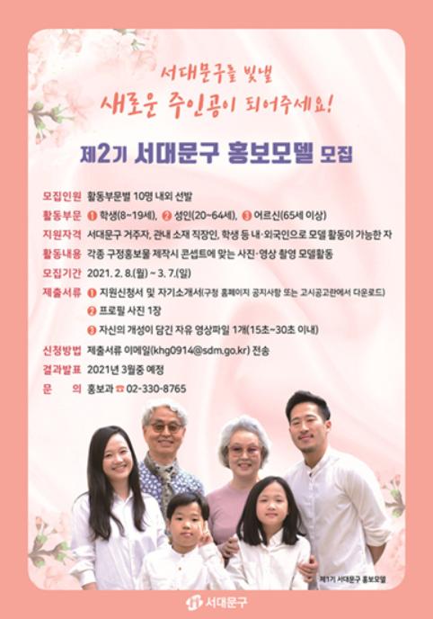 [한국쇼핑몰뉴스, 최영진기자] 서울특별시 서대문구가 구민에게 더욱 친근하게 다가서는 구정 홍보를 위해 ‘제2기 서대문구 홍보모델’을 선발한다.