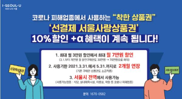 선결제 서울사랑상품권은 사회적 거리두기로 영업이 제한된 업소를 지원하기 위해 서울시가 발행한 상품권이다.