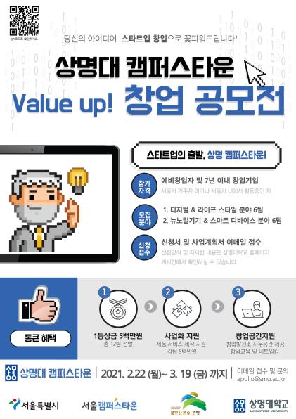 [한국쇼핑몰뉴스, 최영진기자] 은평구는 상명대학교와 협업하여 진행중인 2021년 상명대학교 캠퍼스타운사업에서 “디지털 융·복합 신산업분야”및 “뉴노멀 기기 & 스마트 디바이스 분야”2개 분야 창업공모전을 실시한다고 밝혔다.
