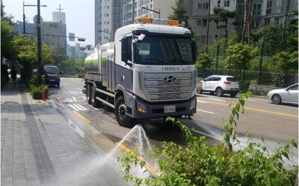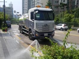 가로살수차 4대와 고압세척 살수차 1대를 동시 투입하여 도로 및 보도상 설치된 버스정류장, 배전함, 교통표지판 등 가로시설물을 물 세척하여 도로에 쌓인 미세먼지와 찌든 때 등을 깨끗이 청소한다.