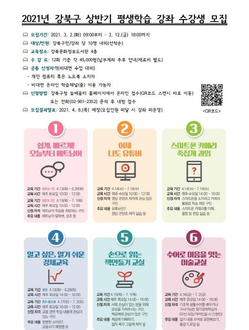 [한국쇼핑몰뉴스, 최영진기자] 강북구가 구민 학습권 보장을 위해 4월부터 상반기 평생학습 강좌를 운영하고 수강생을 3월 12일(금)까지 모집한다.