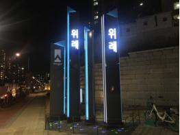 이에 송파구는 위례동 전체 지역의 정체성을 수립하고 역동적인 발전을 기원하고자 행정구역 초입에 안내표시물을 제작?설치한 것이다. 높이 4.4~6m, 폭 0.4~0.8m 지주타입의 스틸 조형물 4개로 구성된 안내표시물은 역사?문화?예술의 흐름이 모이는 위례의 도시특징을 담았다.