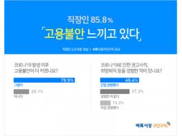 직장인들의 고용 불안감은 코로나19 발생 이후 더욱 커진 것으로 조사됐다. 설문에 참여한 응답자 중 79.9%가 코로나19 이후 고용 불안이 더 커졌다고 답했으며 코로나19로 인한 권고사직, 희망퇴직 등 구조조정을 직·간접적으로 경험했다고 답한 응답자도 62.7%에 달했다.