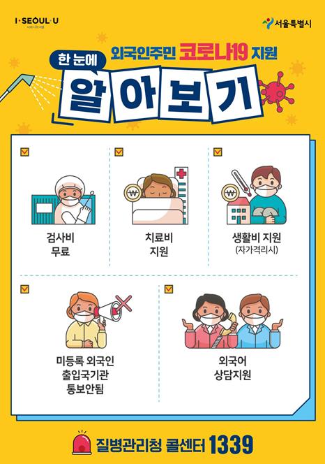 주요 안내사항은 ▲코로나19 검사비 무료, ▲자가격리 시 생활비 지원, ▲확진 시 격리입원치료비 전액 지원(해외 입국자의 경우 상호주의 원칙에 따름), ▲불법체류자 출입국기관 통보의무 면제 ▲외국인지원시설을 통한 다국어 통역지원(13개 국어) 등이다.