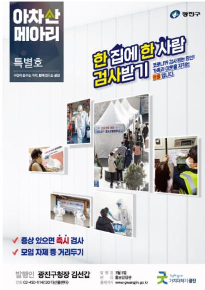 이번 특별호는 광진구 감염 사례를 소개하며, ▲한 집에 한 사람 검사받기 ▲증상 있으면 즉시 검사 ▲지인 모임 자제 등을 간곡히 호소하는 내용을 담았다.