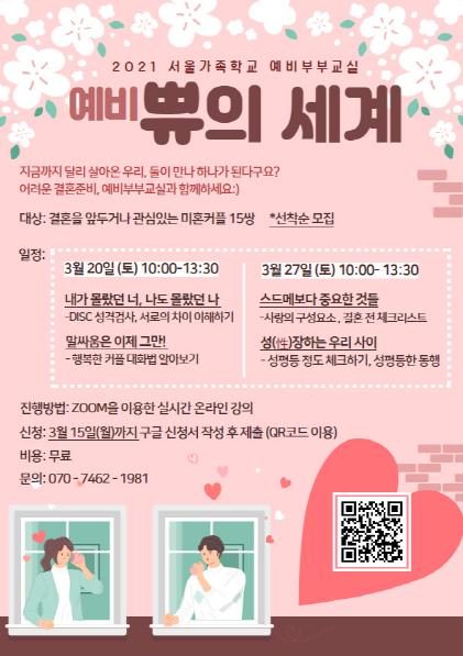 [한국쇼핑몰뉴스, 최영진기자] 강북구건강가정·다문화가족지원센터가 2021 서울가족학교의 일환으로 온라인 예비부교실 “우리 결혼 준비할까요?” 프로그램을 진행한다.