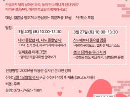 수업은 3월 20일(토), 27일(토)에 실시된다. 총 4회기로 나눠 ▲내가 몰랐던 너, 나도 몰랐던 나 ▲말싸움은 이제 그만! ▲스드메(웨딩사진, 드레스, 헤어메이크업)보다 중요한 것들 ▲성(性)장하는 우리사이 등을 주제로 교육이 진행될 예정이다.