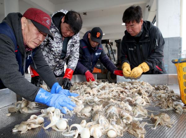 [한국쇼핑몰뉴스, 함선아기자] 15일 태안군 근흥면 신진항 수협 위판장에서 어민들이 수확한 주꾸미를 선별하고 있다.