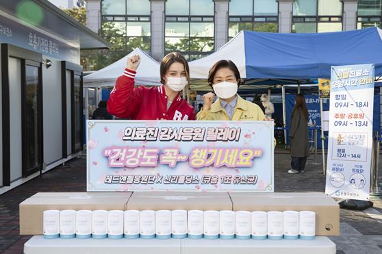 레드엔젤 응원단은 “자랑스런 은평구, 대!한!민!국! 사랑스런 의료진, 대!한!민!국!”의 힘찬 문구로 의료진을 격려하고 코로나 극복의 희망을 담은 응원을 진행했다. 아울러, 은평구 의료진의 건강을 위해 준비한 700만원 상당의 큐옴 1조 유산균을 전달했다.