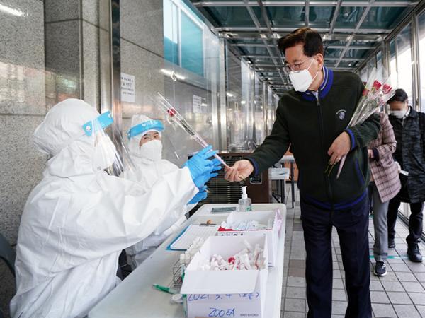 이후 유 구청장은 동대문구보건소 선별진료소로 발걸음을 옮겨 여성 의료진에게 장미를 건네며 그 동안의 헌신과 노고에 경의를 표했다.