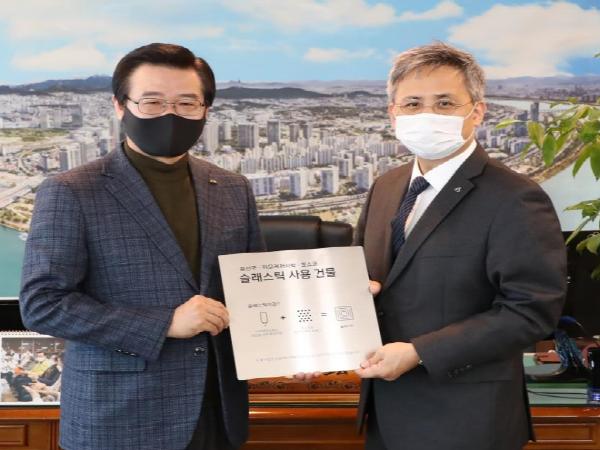 [한국쇼핑몰뉴스, 최영진기자] 성장현 용산구청장이 8일 김승환 아모레퍼시픽복지재단 이사장으로부터 ‘슬래스틱 사용 건물’이라고 적힌 이태원 공중화장실 현판을 전달받았다.