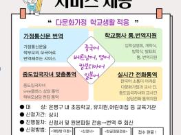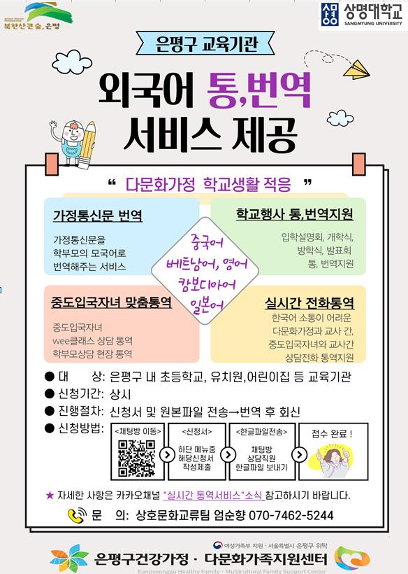 ‘서비스’는 은평구 내 어린이집, 유치원, 초등학교 등 교육기관에서 언제든 신청할 수 있고, 중국어·베트남어·영어·일본어·필리핀어·캄보디아어 6종의 언어로 ▲가정통신문 번역, ▲학교행사 번역, ▲중도입국자녀 맞춤 번역 ▲실시간 전화통역(중국어, 베트남어) 등의 서비스를 이용할 수 있다.