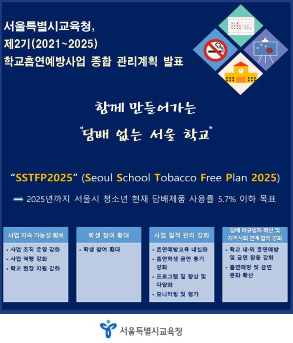 서울 학생의 담배 사용 감소를 달성하기 위하여, 향후 5년간(2021~2025) 시행될 「제2기 학교흡연예방사업 종합 관리계획 SSTFP2025(Seoul School Tobacco free Plan 2025)」를 새롭게 제시하였다. 다양화되어가는 담배 형태를 고려하여 전자담배를 포함한 ‘담배제품 사용률’을 2025년까지 5.7% 이하로 줄이는 것을 목표로 설정하였다.