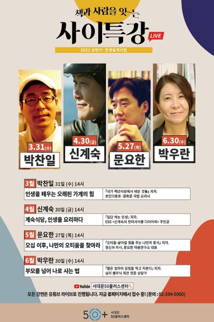 [한국쇼핑몰뉴스, 최영진기자] 서대문50플러스센터는 박찬일, 신계숙, 문요한, 박우란 등 최근 발간된 화제의 책 저자 4인과 함께하는 ‘2021 상반기 책과 사람을 잇는 온라인 사이특강’을 연다고 15일 밝혔다.