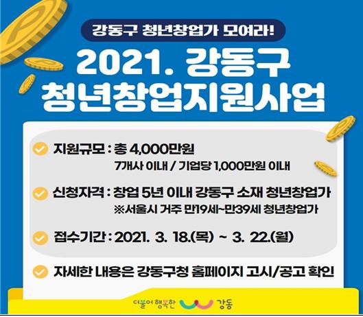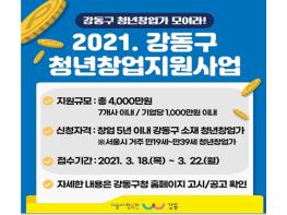 [한국쇼핑몰뉴스, 최영진기자] 강동구가 우수한 아이디어와 기술력 등 성장잠재력을 갖춘 청년창업가를 육성하기 위해 ‘2021년 청년창업지원사업’ 참여기업을 3월 18일부터 22일까지 모집한다.