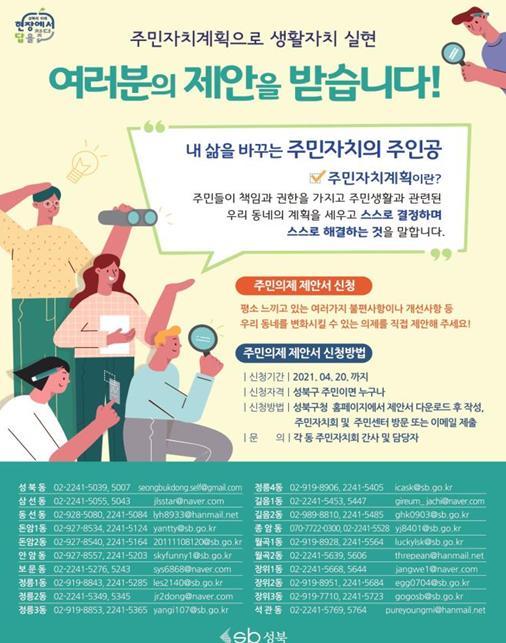사업제안서는 성북구 주민이면 누구나 낼 수 있으며, 성북구청 홈페이지에서 서식을 내려 받아 작성 후 4월 20일까지 해당 동 주민자치회 사무실과 주민센터로 방문 혹은 이메일 제출하면 된다.