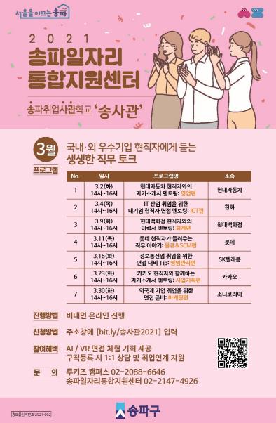 프로그램은 감염병 예방을 위해 온라인으로 진행된다. 참여 신청은 온라인(bit.ly/송사관2021)으로 접수하면 된다. 참여자 모두에게 AI/VR 면접 체험기회가 제공되며 구직등록 시 1:1상담 및 취업연계 서비스도 받을 수 있다.